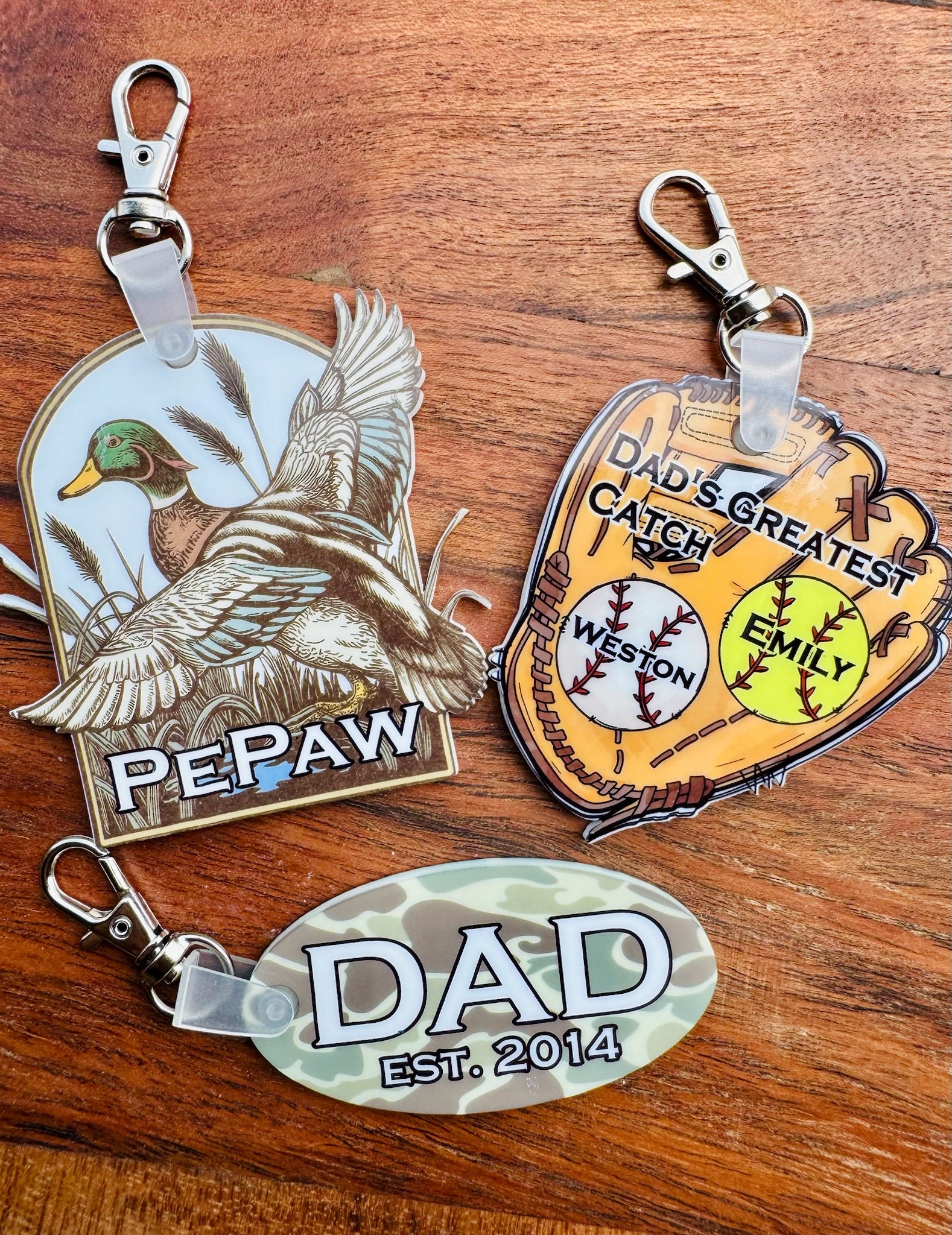 Add a personal touch to your keys or bag with these 2.5” custom keychains! Each design is uniquely illustrated and personalized just for you—whether it’s a duck for “Pepaw,” a baseball glove for Dad’s greatest catch, or a camo tag with a special date. Made from durable material with a sturdy clip, these keychains make perfect gifts for dads, grandpas, and more.
