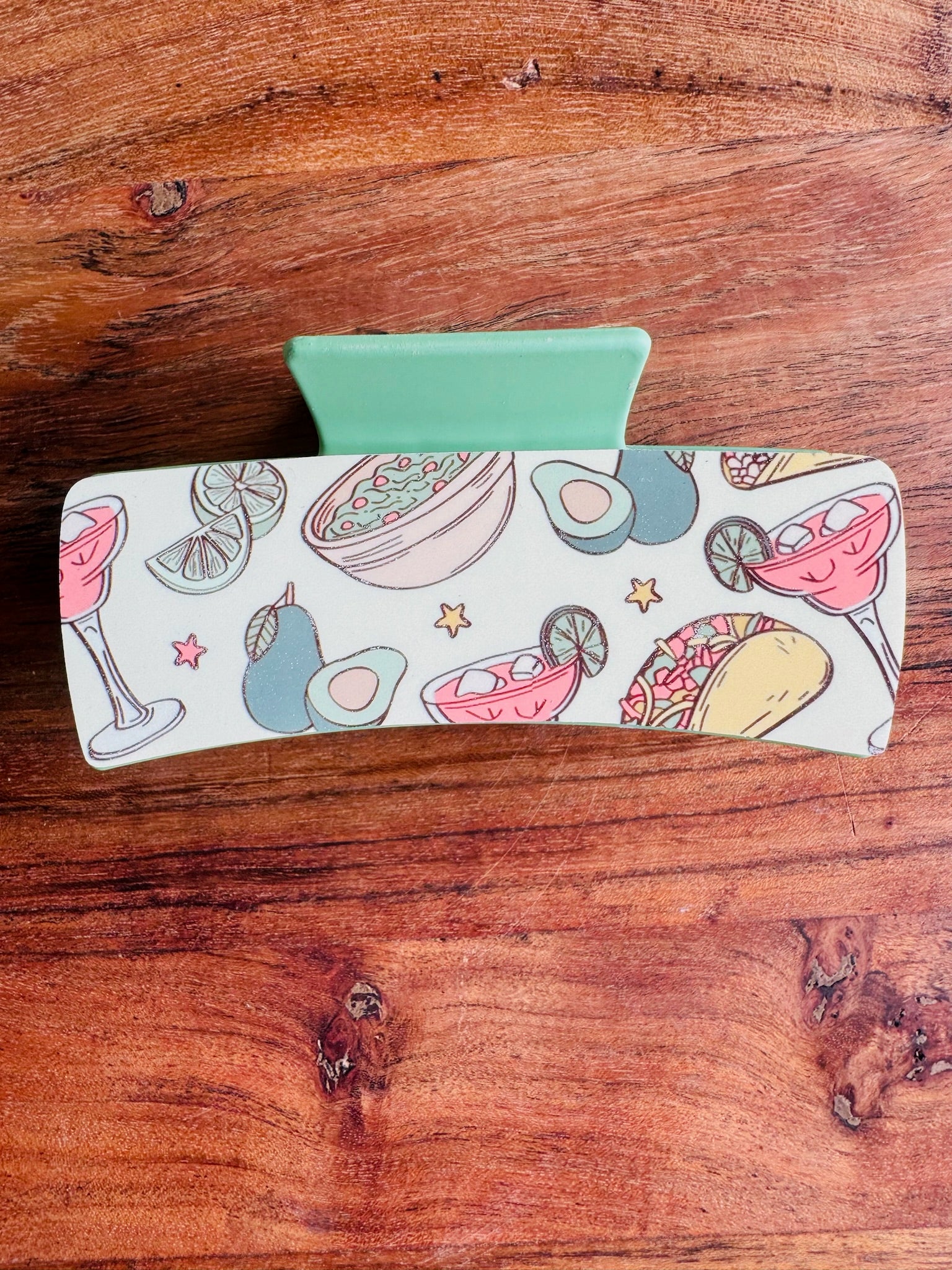 Bring the party to your hairstyle with this festive claw clip covered in fun, tacos, margaritas, avocados, and more! Whether you’re headed to brunch, Taco Tuesday, or just want a pop of personality in your everyday look, this clip delivers playful charm with a strong, secure hold.