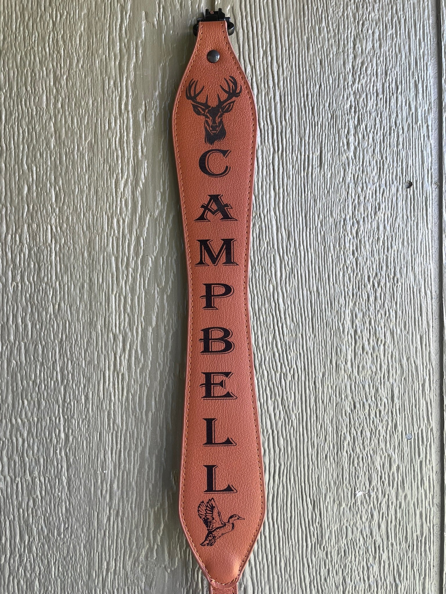 Custom leather gun strap with your name expertly engraved. A durable and personalized accessory, designed for both style and function