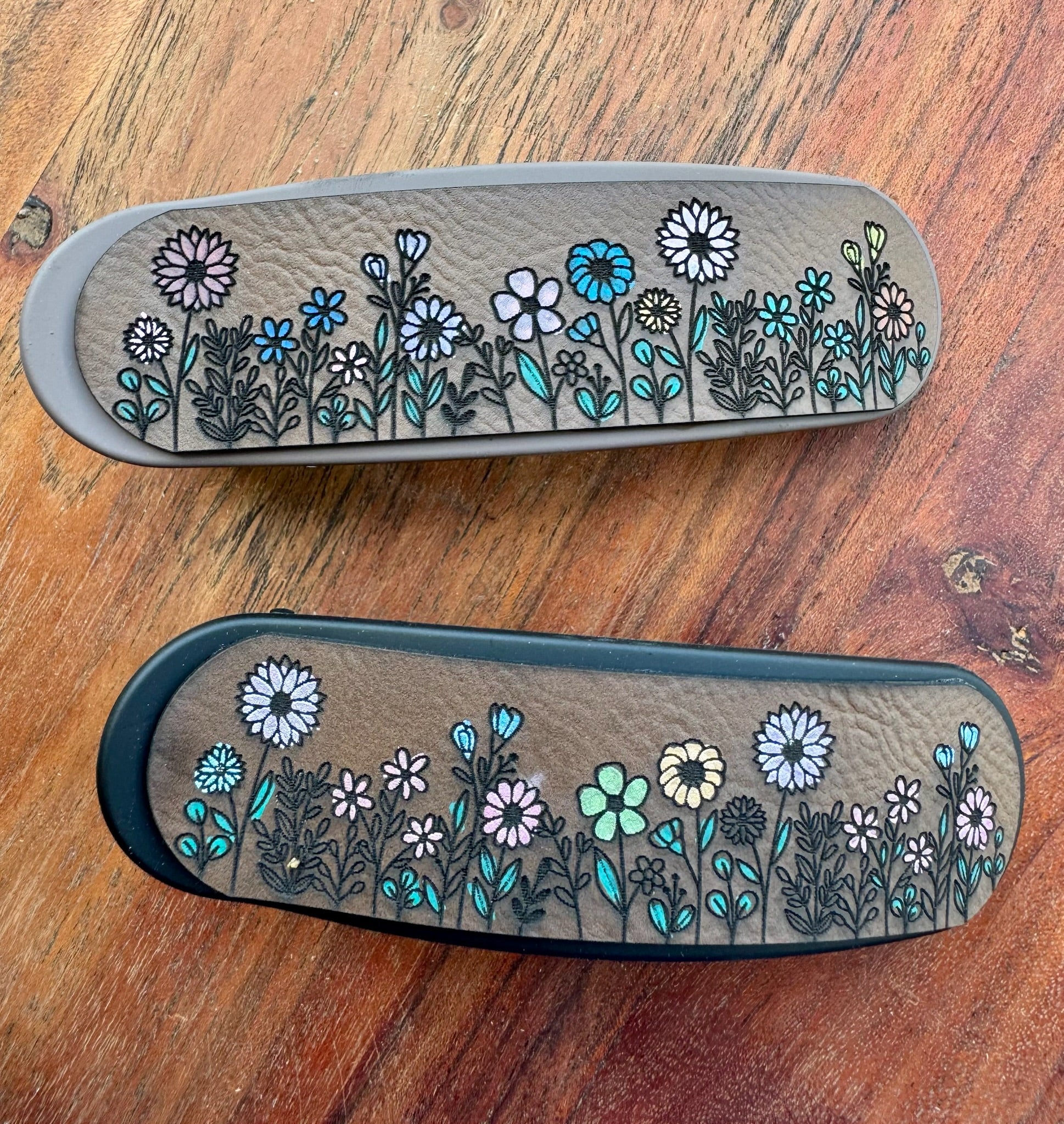 Bring a little bloom to your everyday with our Wildflower Flat Claw Clip. Featuring a hand-drawn floral design on soft faux leather, this low-profile clip is perfect for comfortable all-day wear. Great for half-up styles, messy buns, or a quick hair sweep. A beautiful blend of function and floral charm.